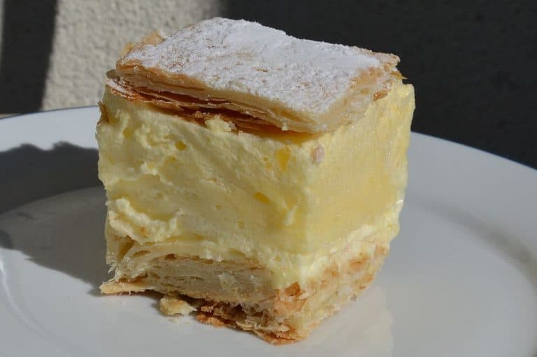Also known as mille-feuille, mille foglie, or vanilla slice, this famous cake is composed of puff pastry and pastry cream. Hungarians make the puff pastry very light, but crunchy: you will enjoy biting it, but cutting it with a spoon will be really hard! The cream is usually soft and rich, with a strong vanilla taste, but not too sweet. The pastry/cream ratio definitely favours the cream, which matches perfectly the crunchiness of the pastry.