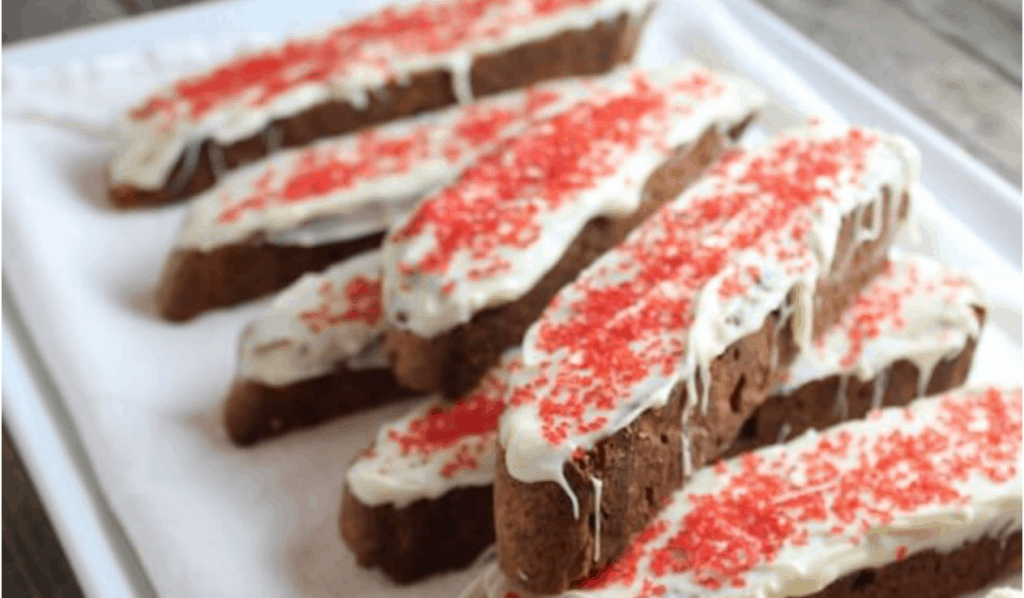 Twice-baked, oblong-shaped, crunchy Italian cookies made with dried cranberries, almonds, and lemon zest and layered with white chocolate and sprinkles.