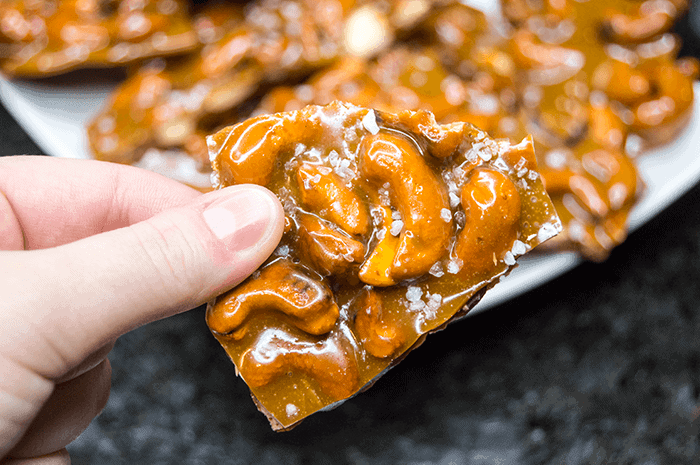 A crunchy treat featuring cashews coated in a sweet and salty brittle that makes for a perfect snack or gift for the holiday season.