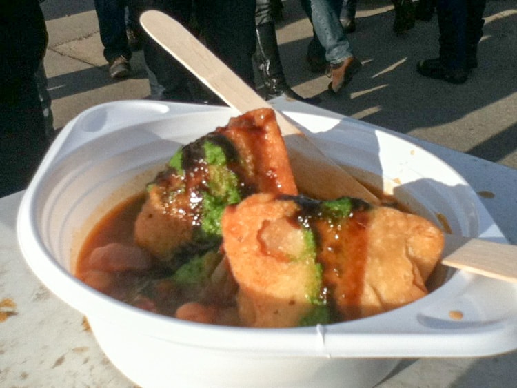 One of the most popular dishes among omnivores and vegetarians at Weihnachsmarkt am See is Käsespätzle, a southern German dish of fresh egg pasta and cheese. Vegans are best off heading to one of the Indian or Moroccan stalls instead. My personal favorite is the samosa chaat at Bombay Hut. This Indian street food snack consists of two vegetable samosas covered in a chickpea curry and various chutneys.
