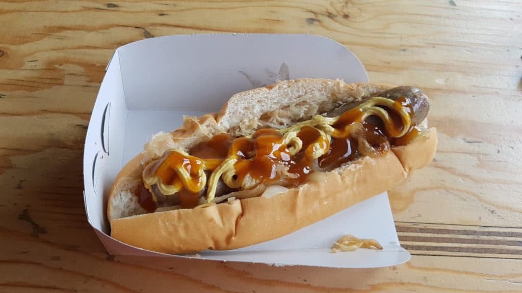 The version in the picture is a Bratwurst served on a roll with Sauerkraut and fried onion. It is left up to the customer to add the preferred sauces.
