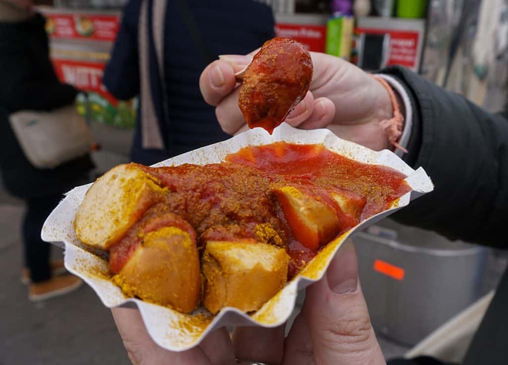 Currywurst is a fusion dish, of sorts, where it takes the humble steamed Bratwurst, and fries it, before serving it, cut into pieces, with a tomato sauce laced with curry.