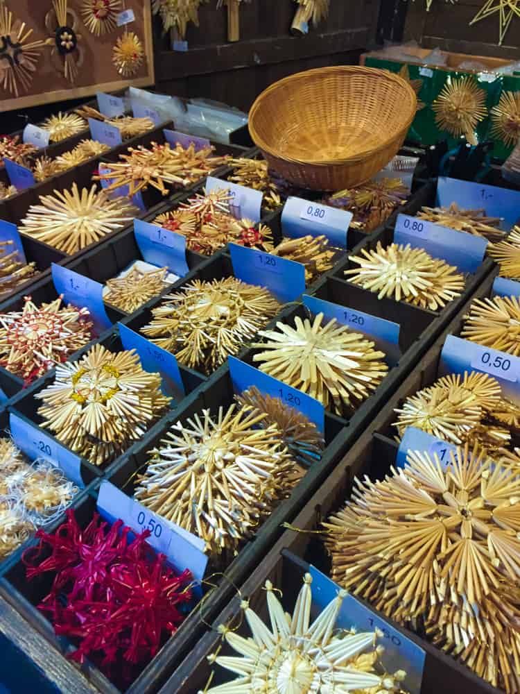 I also have a set of lightweight straw ornaments that look like acorns, angels, and decorative stars. I got mine at a Christmas market in Germany but you can get a set here or this set here. (The sets are technically Scandinavian but they look very similar to the German set I have.)
