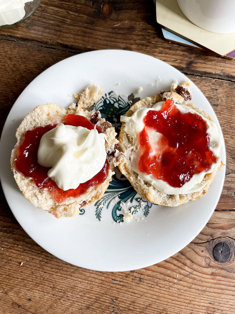 You can use any good quality tea but black tea is the most traditional choice. If you go for cream tea in a tea house, you’ll likely be given a tea menu to choose from. I almost always choose Earl Grey but my husband usually orders green tea. Usually there are also herbal and other decaf teas on the menu, and I’ve also seen options for coffee instead of tea.