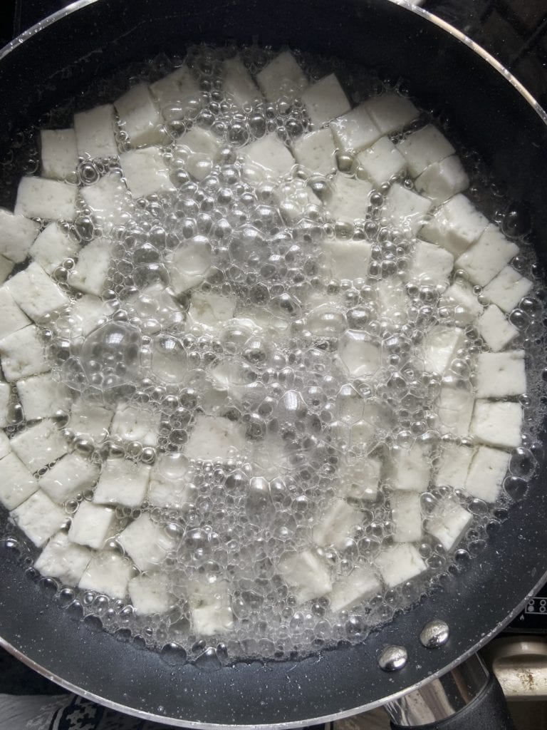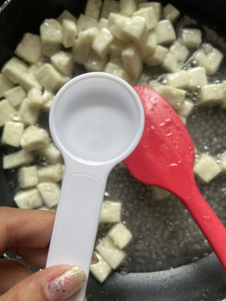 - Once the sugar has completely dissolved and the syrup is simmering, add paneer pieces and stir gently and continuously.