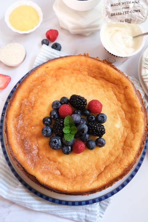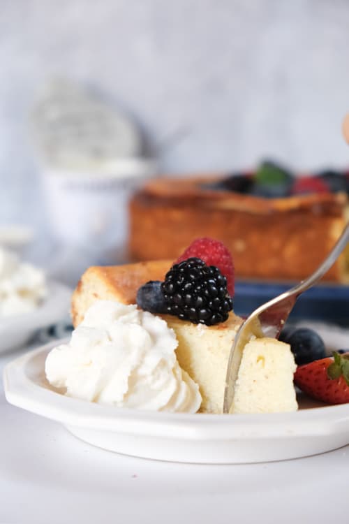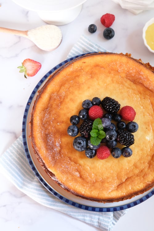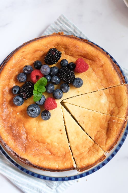 This crustless German cheesecake is a quick and easy dessert that’s full of flavor. It’s delicious on it’s own (my husband and I devoured it) but you can also serve with fresh berries and side of whipped cream.