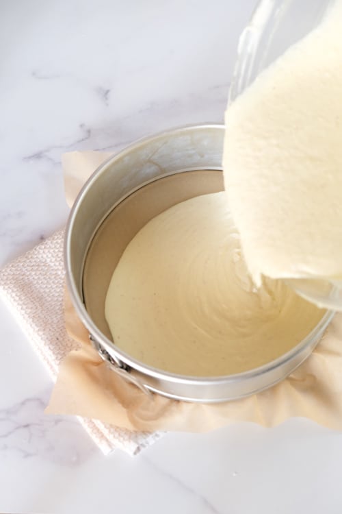 Secure the springform pan ring and then pour the cheesecake batter into the pan.