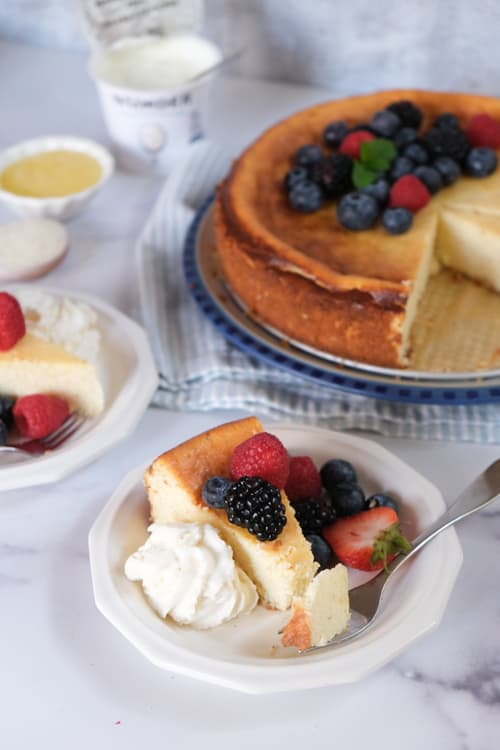 I’ve made this cheesecake both ways and while the texture was a little different (a little softer), it still turned out fine. It might look a little different, too, but that’s ok! The cheesecake on the left is one I made with Wünder Quark (it’s supposed to sink in the middle). The one on the right was made with Greek yogurt. The texture of the cheesecake made with real Quark was more like what I ate in Germany but the Greek yogurt cheesecake was delicious, too.