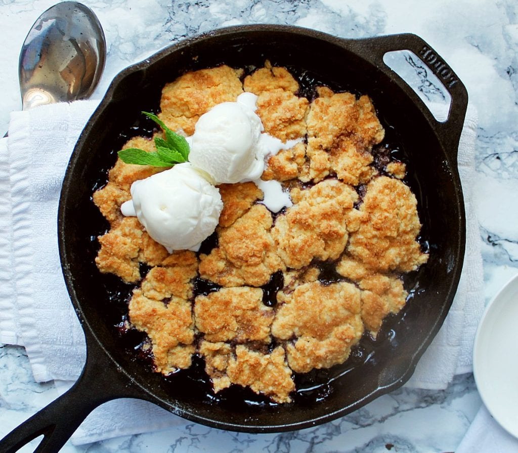 This blueberry cobbler is so easy to make in a cast iron skillet, and it's topped with a simple biscuit topping and smoked sugar!