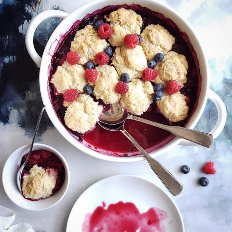 Sweet, tart and topped with from-scratch biscuits, Mixed Berry Cobbler is a drool-worthy dessert. Packed with a medley of fresh, juicy berries blanketed in buttermilk biscuits, this simple recipe is both fruity and foolproof.
