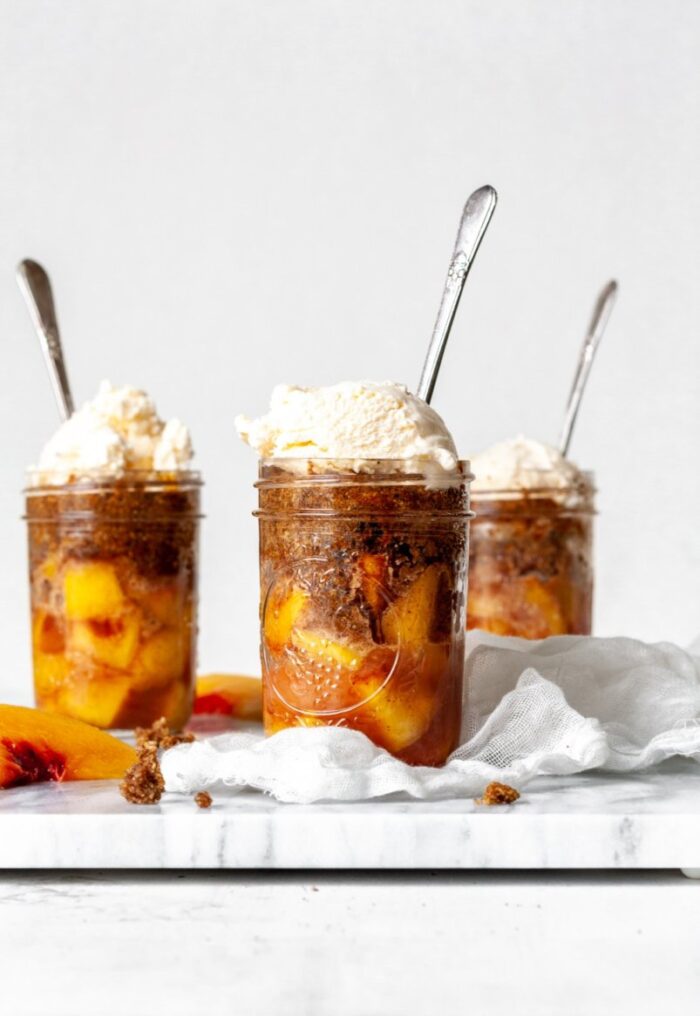 These cute little Peach Cobbler Jars are fun, sweet and fresh! They are easy to make and perfect dessert.