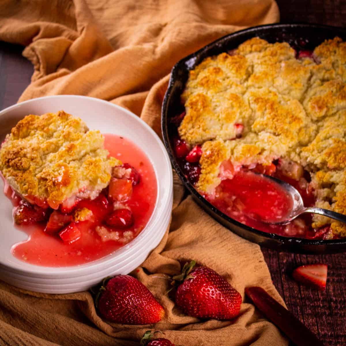 This strawberry rhubarb cobbler takes just 10 minutes to prepare and is the perfect summertime dessert. Sweet and tangy, the filling is mixed right in the skillet and then topped with an easy homemade biscuit dough. This cast iron skillet cobbler is an easy dessert that everyone will love.