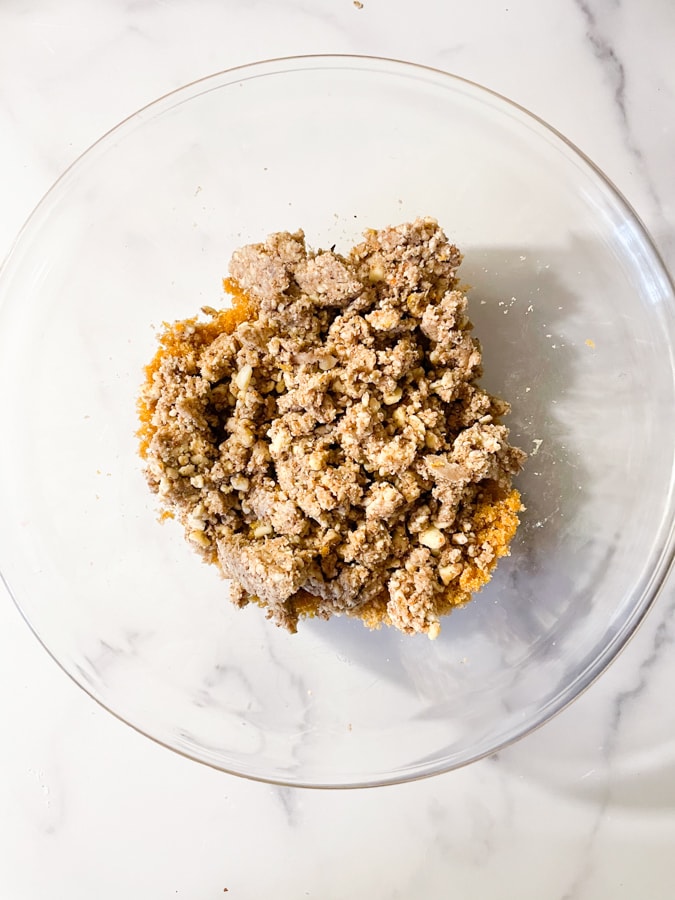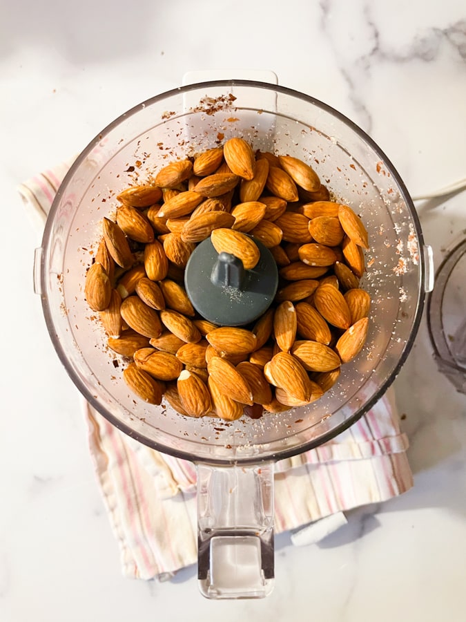 - Use a food processor to grind the almonds and hazelnuts until they're like crumbs. (But be careful that you don't grind so long that they turn into nut butter! It's ok if you have some larger nut chunks.They don't all have to be the same size.) Set ground nuts aside.