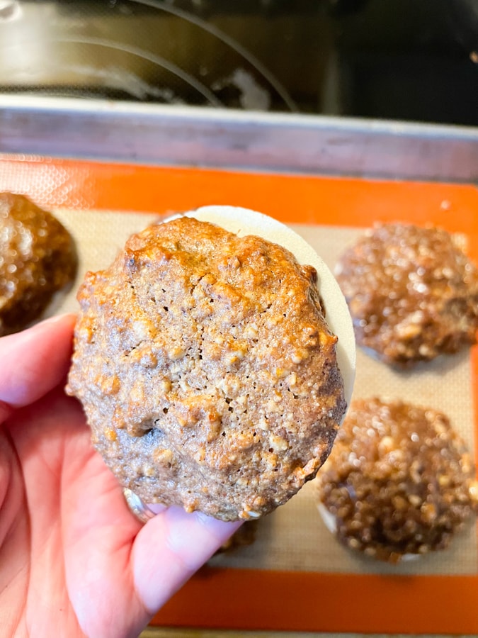 If using the 70mm size, spoon 2 tablespoons dough onto the middle of each wafer. If your dough immediately flattens out and spills out over the wafer, add more ground nuts to thicken it up (try grinding another 1/4 to 1/2 cup).