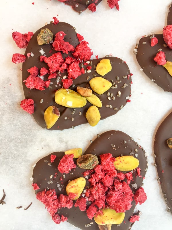 Use a spoon to make chocolate rounds (or hearts for Valentine’s Day!) on a Silpat mat or parchment paper. Then add your toppings. Press them into the chocolate a bit so they don’t fall off when you pick them up.