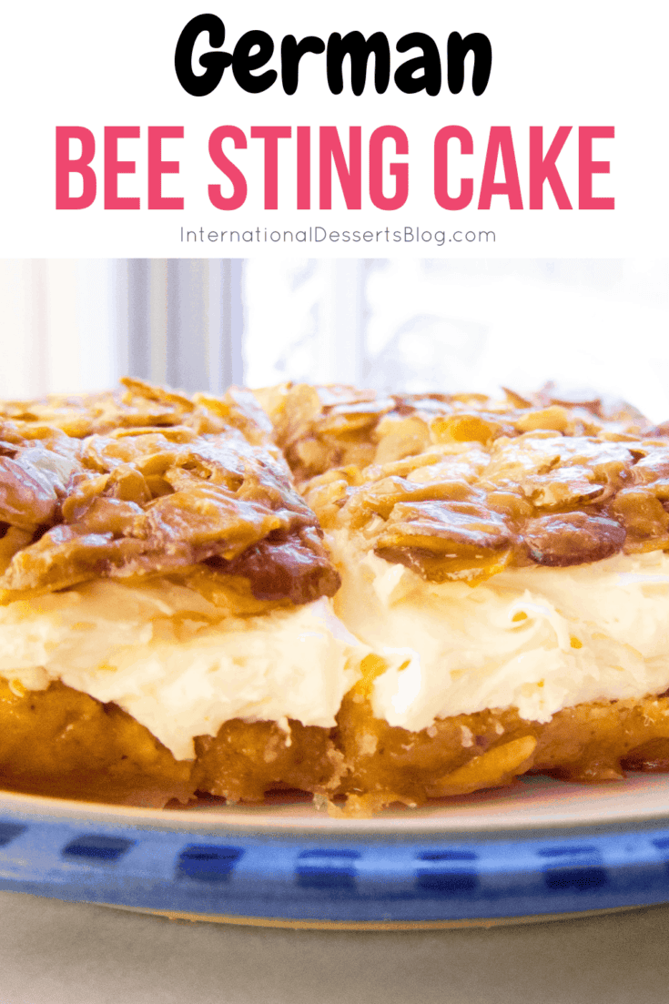 Bienenstich Kuchen ā or Bee Sting Cake ā is a traditional German dessert comprised of two thin layers of yeast cake with a creamy filling, and a crunchy, buttery, honey-and-almond topping.