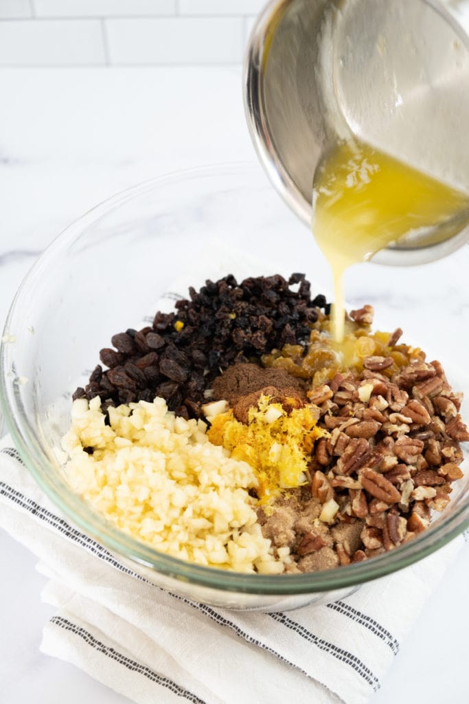 Add raisins, golden raisins, currants, apples, orange and lemon zest, candied zest, brown sugar, spices, pecans, melted butter, and brandy in a mixing bowl.