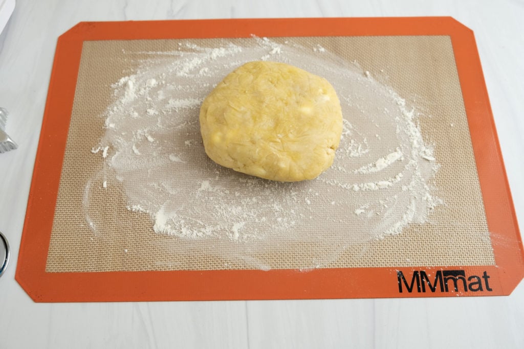 - Form dough into a ball, press into a disk shape, then wrap in plastic wrap and chill in refrigerator for 30 minutes.