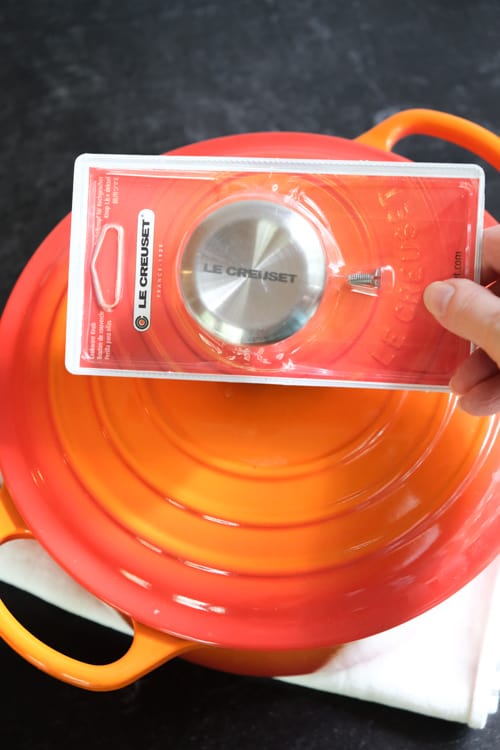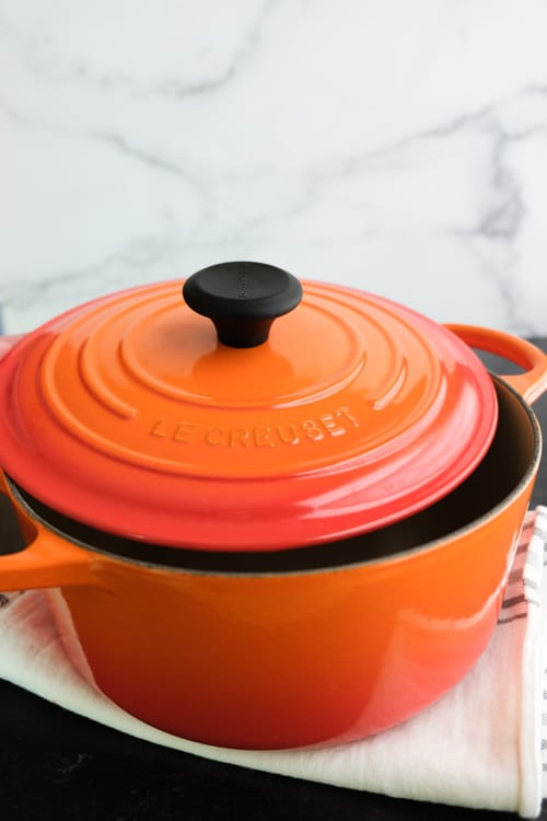 My Le Creuset Dutch oven gets so much daily use that I just leave it on my stovetop! I got mine as a Christmas gift from my husband about 6 years ago and I LOVE it. It’s held up well over the years, and when I did have a small problem with my Dutch oven, Le Creuset replaced it for free. I changed out the handle last year to a metal one so I could bake bread in it (which always comes out perfect).