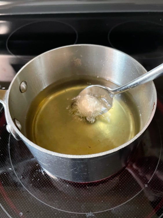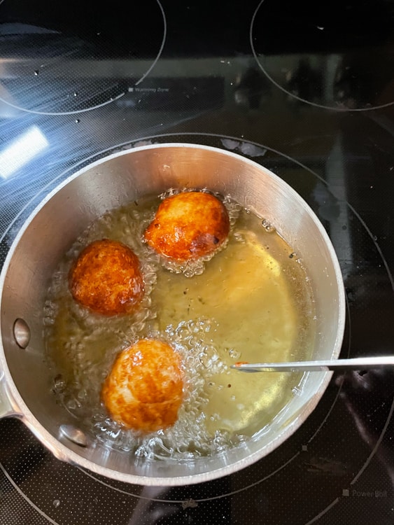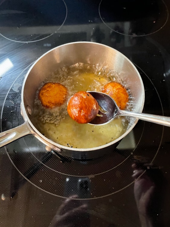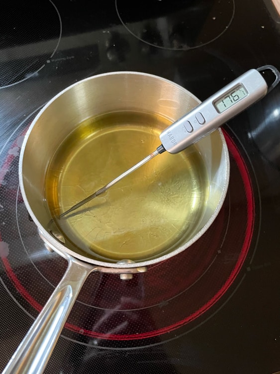 Also — check the oil periodically so you ensure it stays right at 350F/175C. You might need to adjust your stove temp here and there. I found that my oil quickly rose above 350F/175C and I needed to turn the heat down a few times.