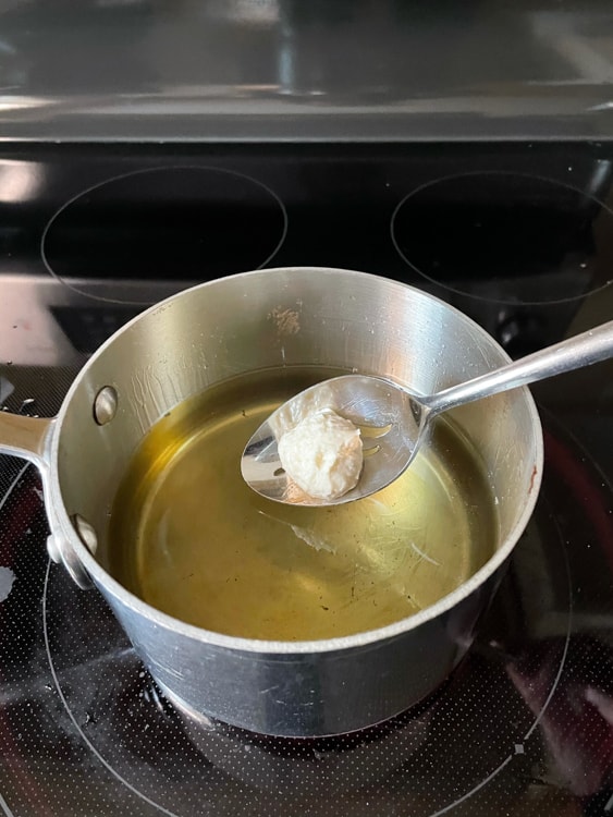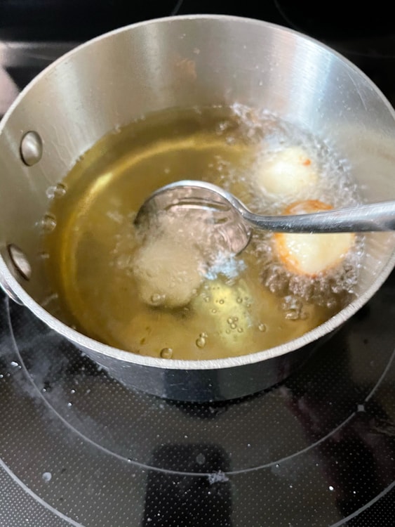 Then, add 3-4 fingers of oil to a saucepan and heat to 350F/175C. Tip: use a thermometer for this! You need the oil to be hot enough to cook your Quark Balls but not so hot they overcook the outside (or even burn) without fully cooking the inside.